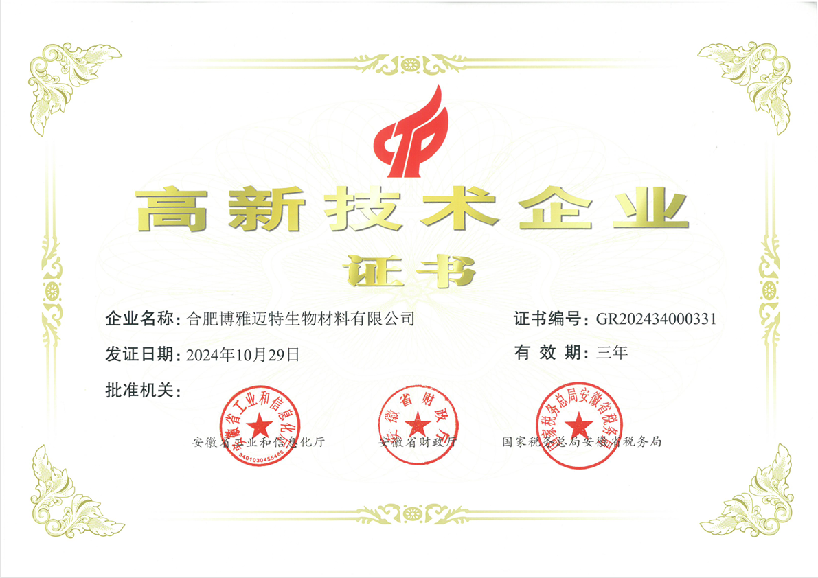 合肥博雅迈特生物材料有限公司由北京大学长江学者郑玉峰教授发起,是一家以先进生物材料技术为核心,专注于为医疗器械行业赋能的国家级高新技术企业。公司以“应用生物材料重塑健康人体”为使命,致力于通过创新生物材料技术和医疗器械产品推动临床应用。
