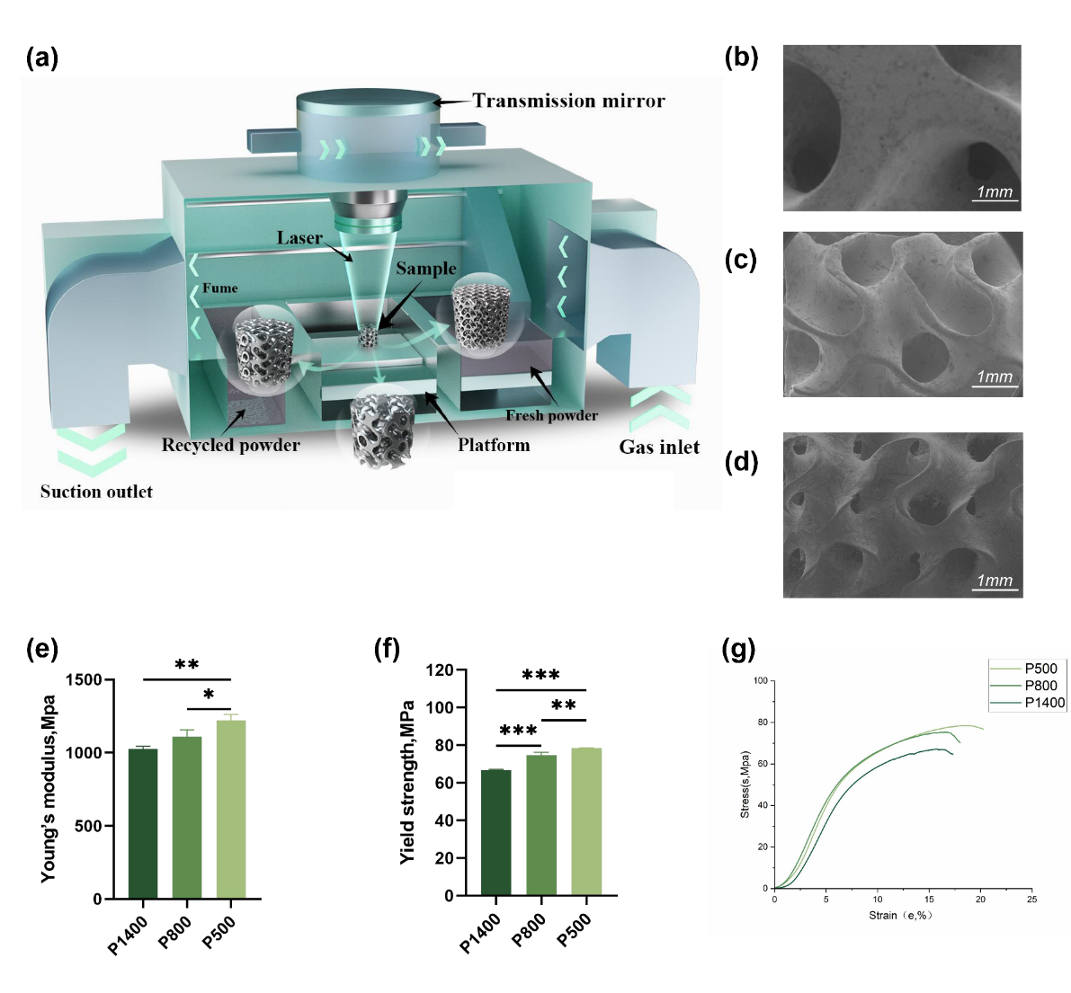 近期,清华大学温鹏,北京大学郑玉峰,北医三院田耘在科爱创办的期刊Bioactive Materials上联合发表研究论文:高温氧化处理3D 打印镁合金骨内植入体结构优化及体内外生物降解行为。利用高温氧化处理工艺,形成的表面氧化层和迁移层减缓了3D 打印镁合金的降解速率。研究团队制备出孔径分别为 500、800 和 1400 微米(P500,P800 和 P1400)的镁支架多孔支架,对力学性能,生物相容性、降解行为和成骨能力进行体内外表征,其中P500结构性能表现良好。由此启发我们通过结构优化设计来调控其力学性能及降解速率,进而实现骨缺损重建。