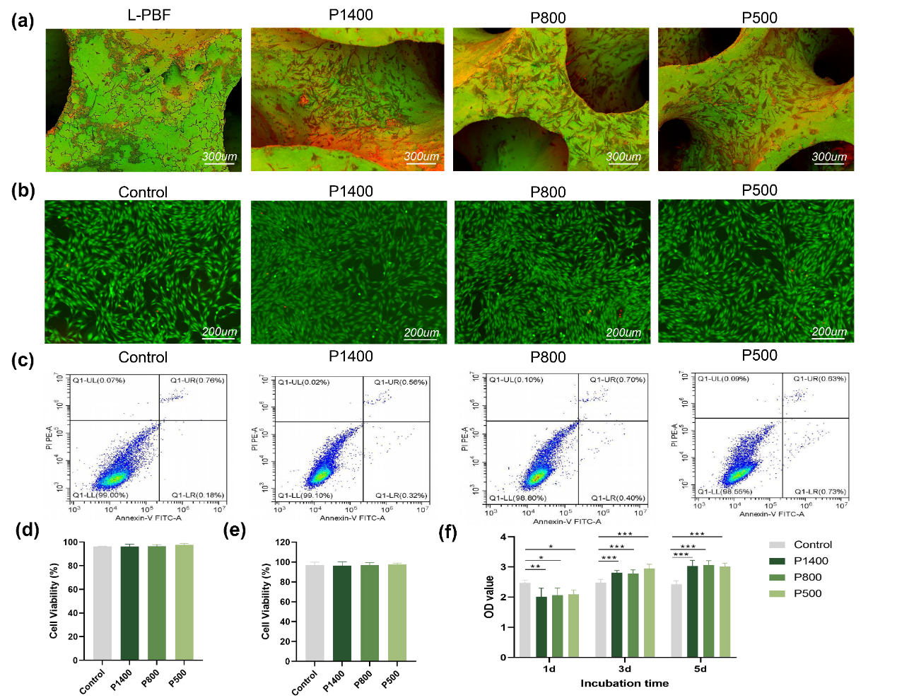 研究团队制备了孔径分别为 500、800 和 1400 微米(P500,P800 和 P1400)的镁合金支架。不同孔径的镁合金支架表面形貌类似,均无明显缺陷(图3b-d)。然而,不同孔径的镁合金支架的体外力学行为存在明显差异,其中P500结构性能表现良好。(图3e-g)