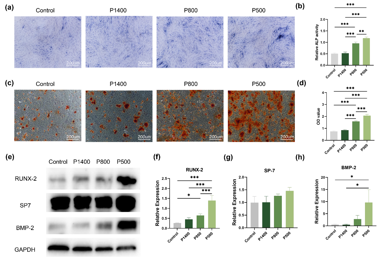 图5:不同孔径的镁合金支架组体外促成骨能力测试:(a)碱性磷酸酶染色和(b) 碱性磷酸酶活性测试,(c-d)茜素红染色及其半定量分析,(e-h) 成骨相关分子蛋白半定量分析结果