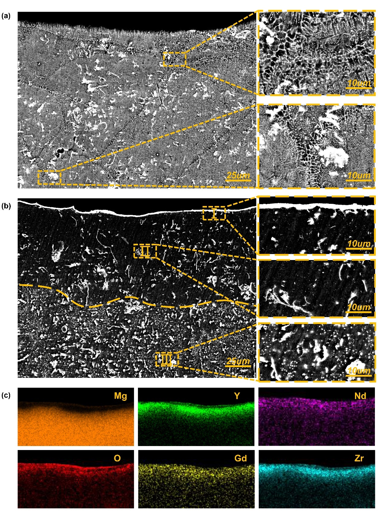 图2:镁合金支架高温氧化处理前后横截面上的 SEM 形貌(a-b)和 EDS 分析(c)