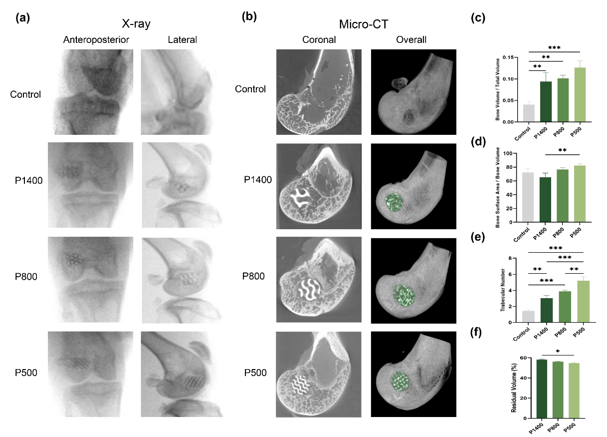研究团队制备了孔径分别为 500、800 和 1400 微米(P500,P800 和 P1400)的镁合金支架。不同孔径的镁合金支架表面形貌类似,均无明显缺陷(图3b-d)。然而,不同孔径的镁合金支架的体外力学行为存在明显差异,其中P500结构性能表现良好。(图3e-g)
