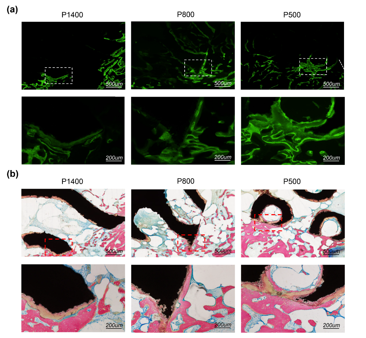 为了研究不同孔径的镁合金支架体内生物降解行为及促成骨能力,研究团队进一步建立了兔股骨髁缺损模型,硫酸钙骨水泥作为对照。WE43多孔支架结构在手术后4周仍然清晰可见,表明支架没有明显降解,具有良好的结构完整性。在骨水泥组,硫酸钙骨水泥完全降解(图6a)。Micro-CT 结果显示镁合金支架组新骨形成量明显高于对照组,并且P500组的 BV/TV,BSA/BV 和 Tb.N 值显着高于 P800和 P1400组(图6b-e) ,表明 P500支架成骨性能优越,较为持久的整理力学支撑有利于围关节骨缺损的修复,具有作为骨科植入物的潜力。对缺损部位进行硬组织切片的结果也与Micro-CT 结果相吻合(图7)。
